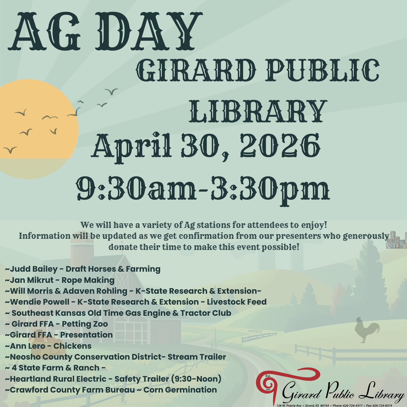 We are excited to host Ag Day again for 2026! This year’s event will be held on Thursday, April 30th from 9:30 am – 3:30 pm!