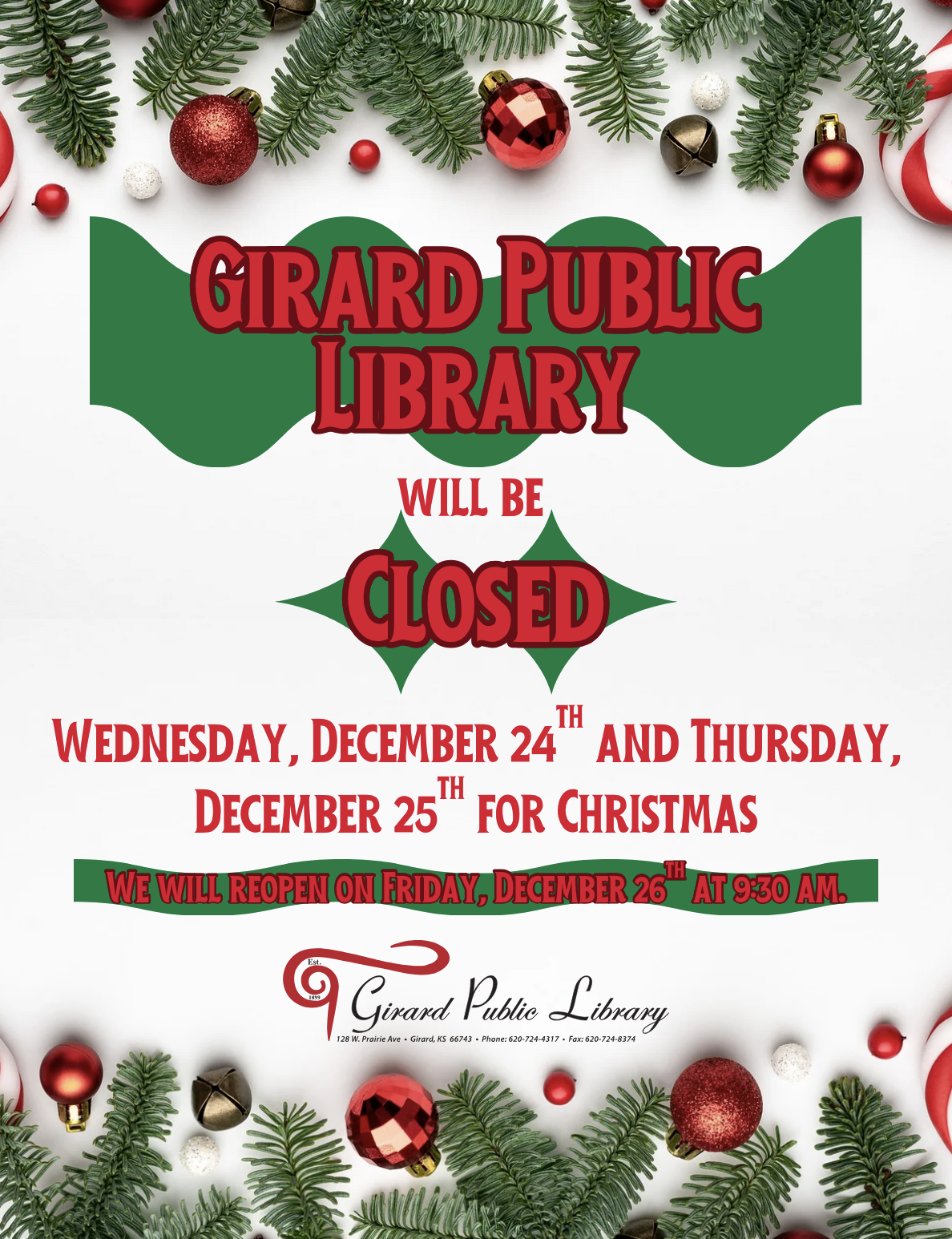 Girard Public Library will be closed Wednesday, December 24th and Thursday, December 25th for Christmas.