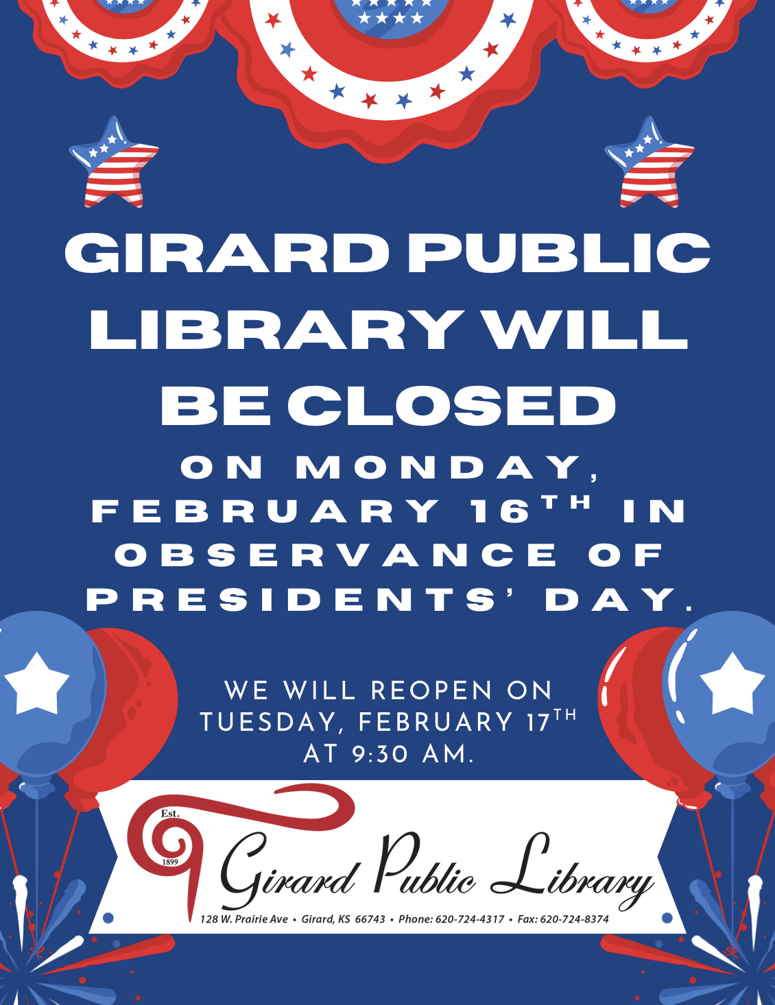 Girard Public Library will be closed on Monday, February 16th in observance of Presidents’ Day.