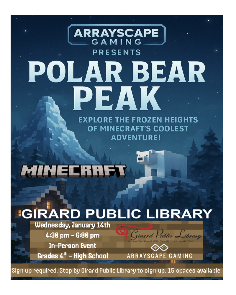 Join Arrayscape Gaming at Girard Public Library on Wednesday, January 14th from 4:30 pm – 6:00 pm!