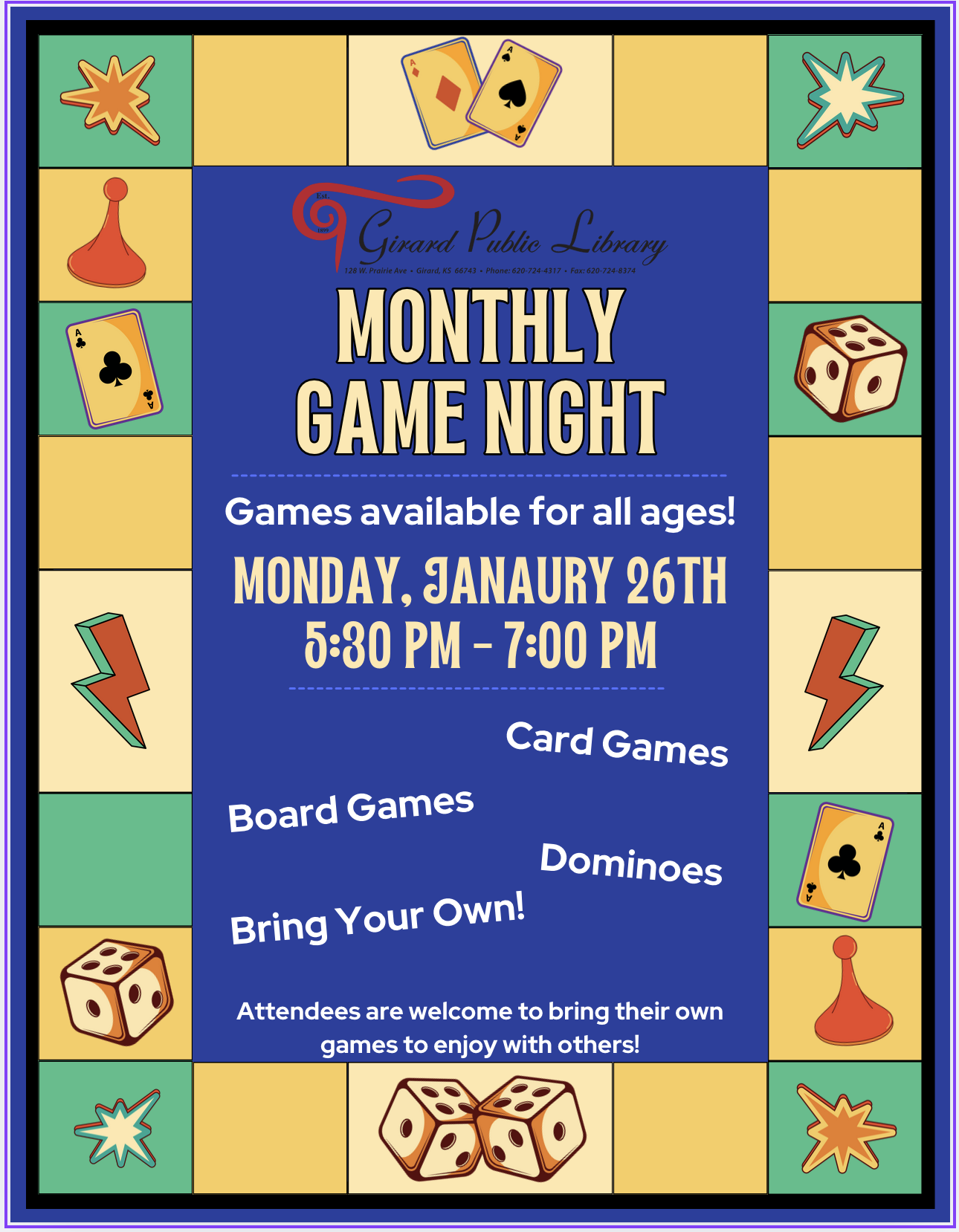 Join us for Monthly Game Night at Girard Public Library on Monday, January 26th from 5:30 pm – 7:00 pm!