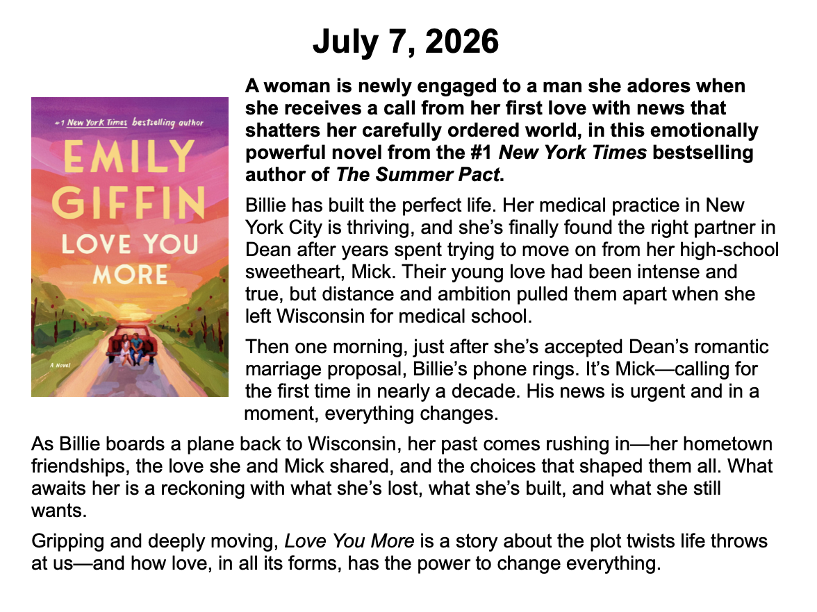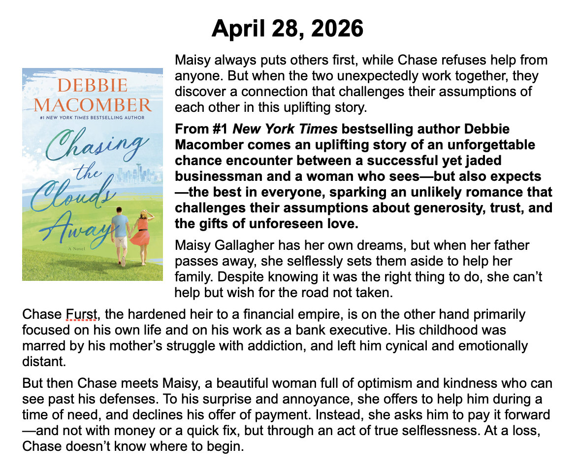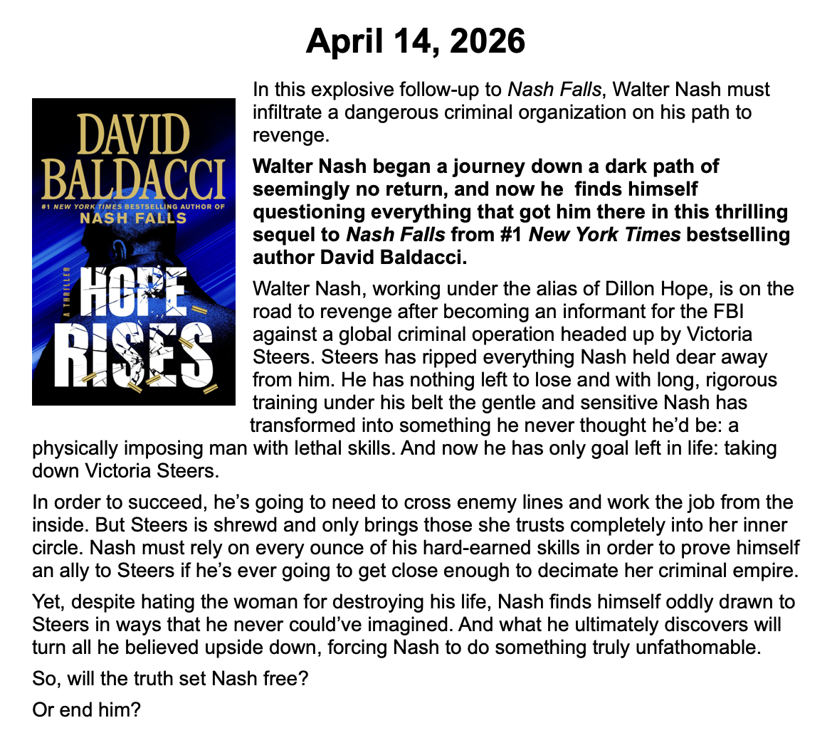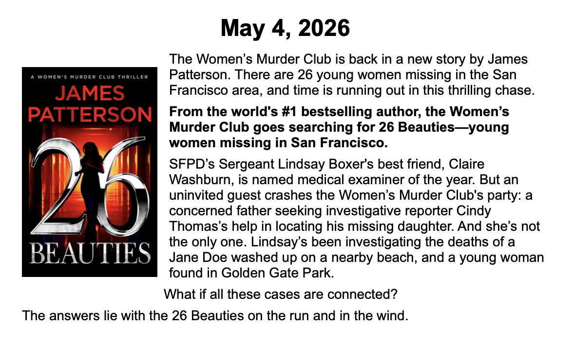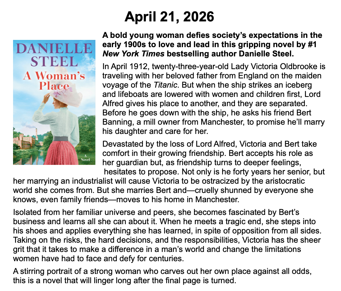 New Releases by Library-Admin-1 | Apr 6, 2026 | Adult Programs, Featured These books will be coming soon and are listed by their release dates. We won’t necessarily have these books in the library, but we can possibly get them from another library.